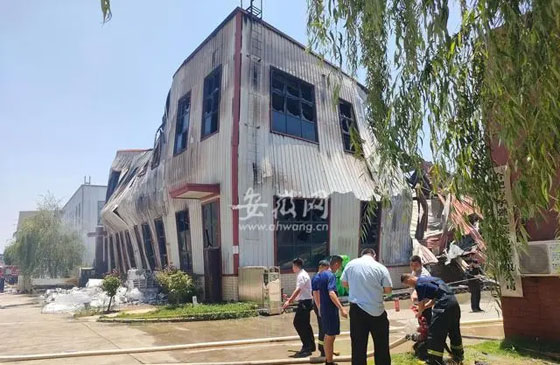 6月15日中午,記者趕到事發(fā)現(xiàn)場時(shí),火勢已經(jīng)被消防人員撲滅。起火公司名稱為合肥盛皓保溫材料有限公司,該公司的生產(chǎn)車間發(fā)生大火,現(xiàn)場的消防人員正在進(jìn)行火災(zāi)的收尾清理工作。在車間東邊和南邊的園區(qū)道路上,停著五六輛消防車,還有一輛合肥燃?xì)鈸屝捃?,合肥燃?xì)夤ぷ魅藛T也趕到現(xiàn)場進(jìn)行安全隱患排查工作。
